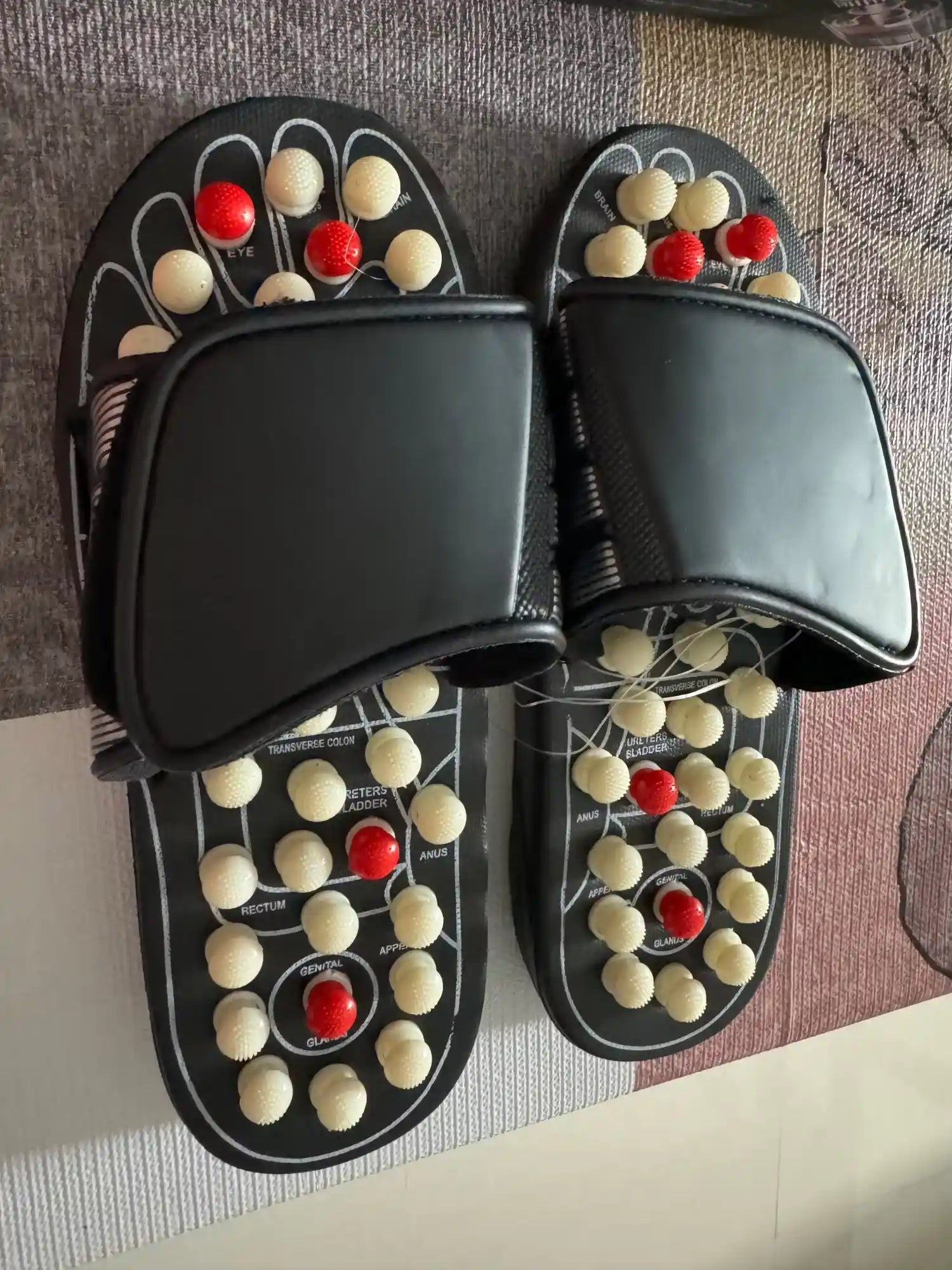 The slippers use acupressure nodes that target specific points on your feet to stimulate blood circulation and relieve pain, providing a soothing sensation and faster recovery.